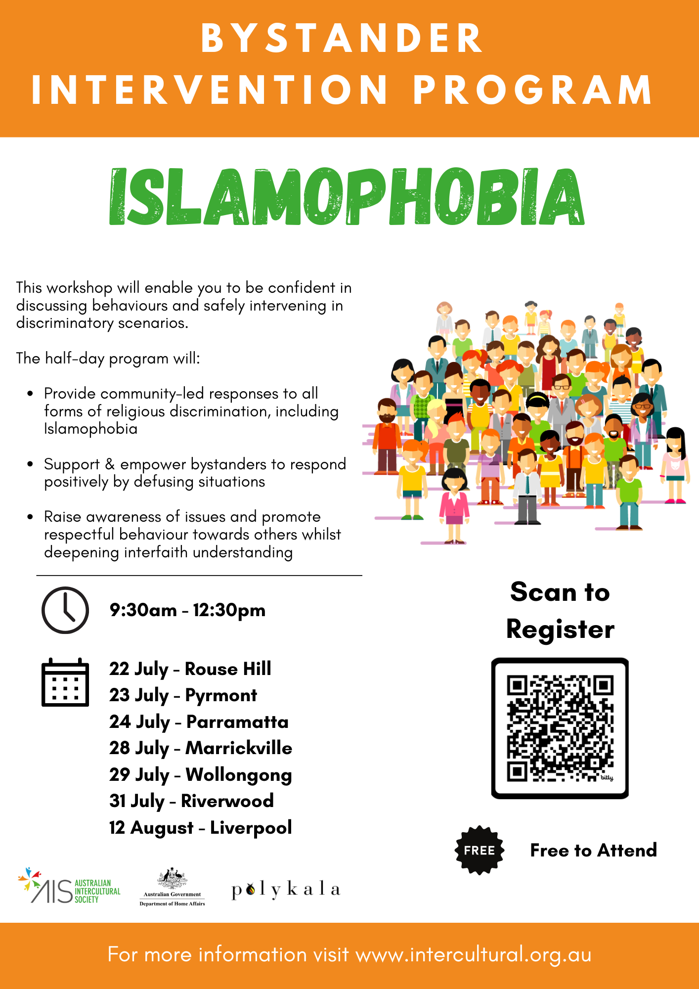 In response to growing levels of hate-fueled rhetoric, discrimination, and social exclusion, this national training program aims to equip individuals with the skills to safely and effectively respond to incidents of Islamophobia and racial or religious discrimination. Organised by the Australian Intercultural Society (AIS) along with delivery partner Polykala, the half-day workshops will be held across Melbourne, Sydney, Brisbane, Adalaide and a few selected regional locations.